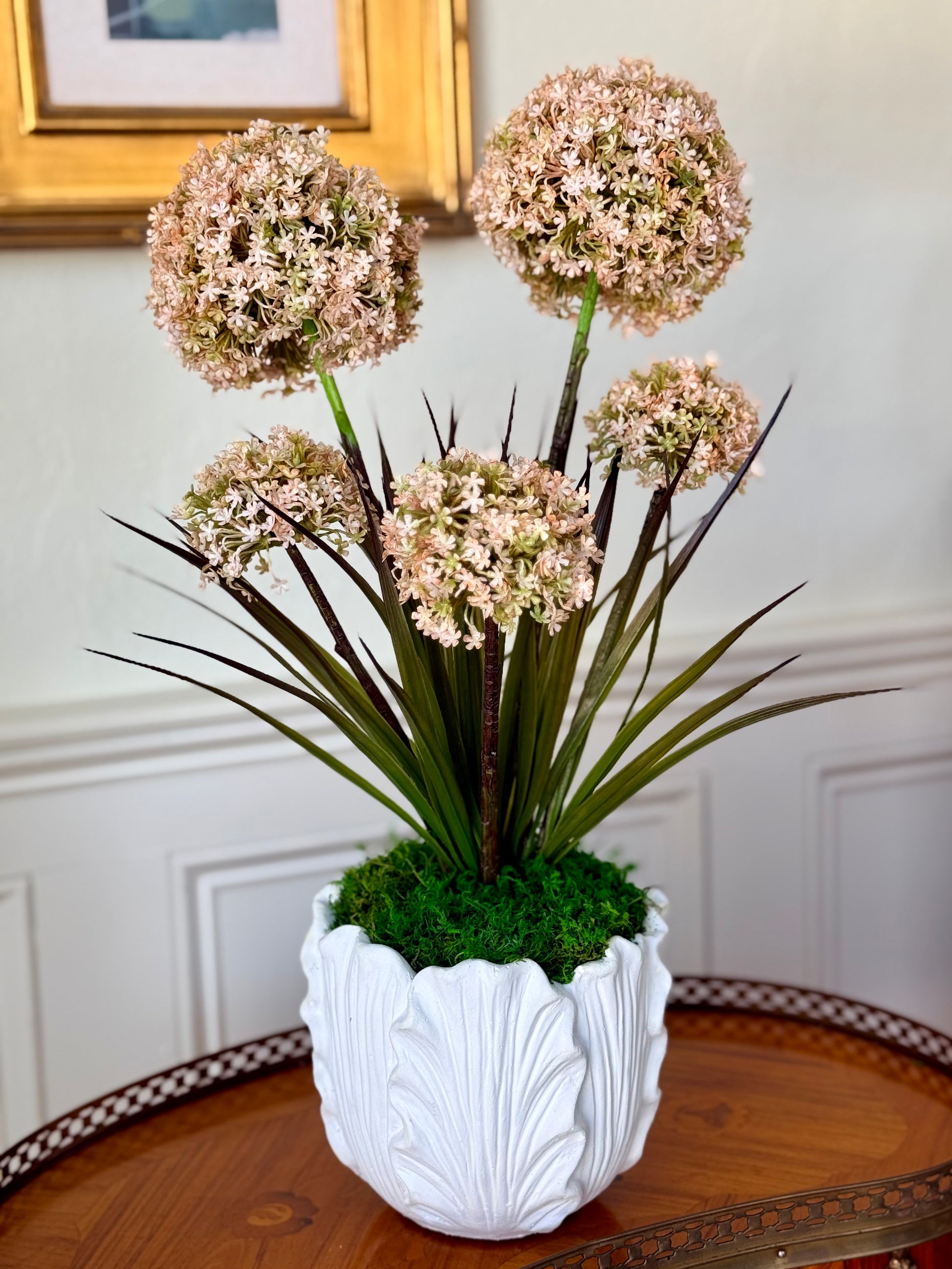 A mix of fine faux pink allium potted by hand in a white vase with cabbage leaf detail, topped with preserved sheet moss.
