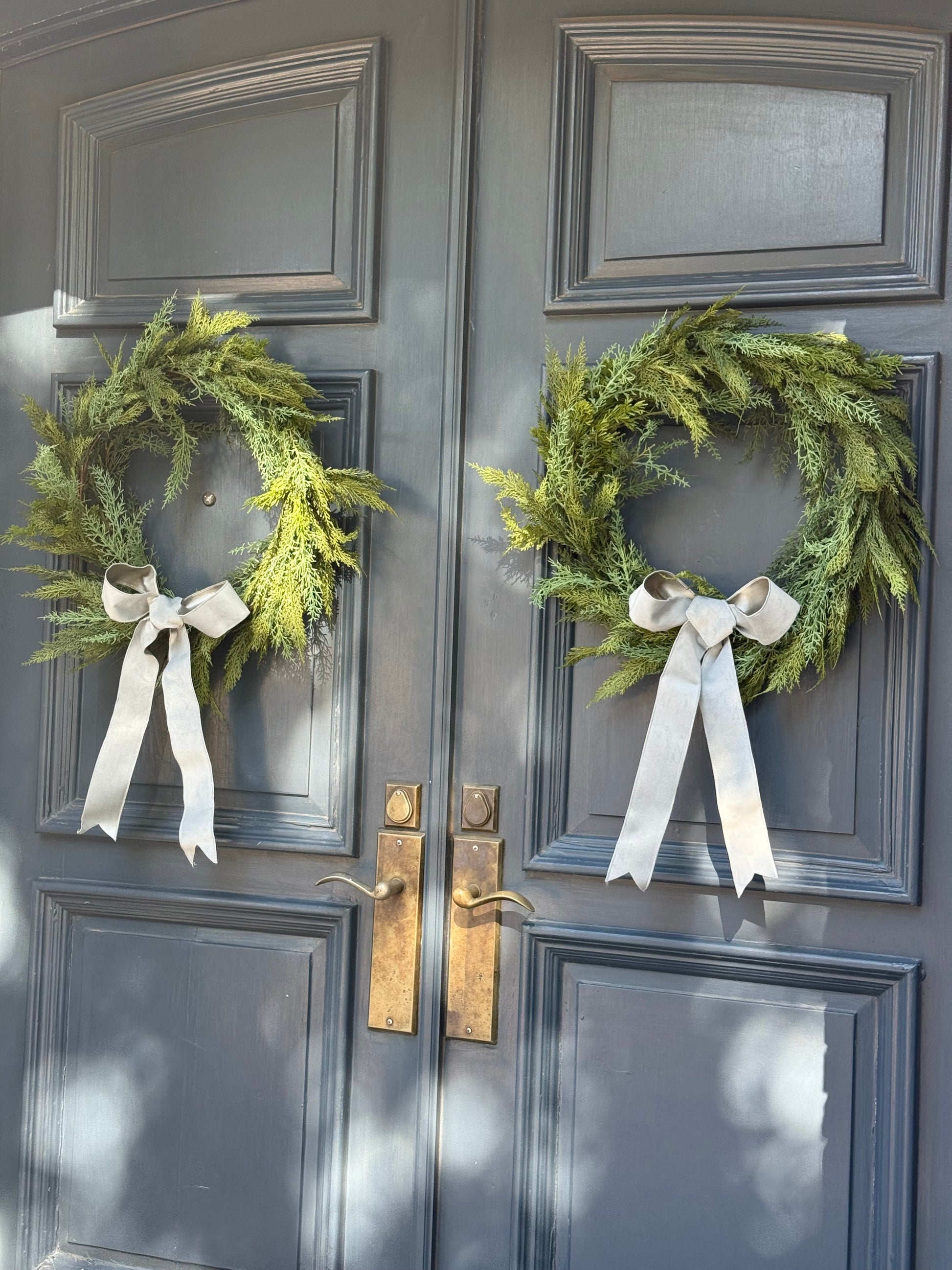 Each 2.5” velvet bow is handcrafted using frosted blue velvet ribbon by D. Stevens.