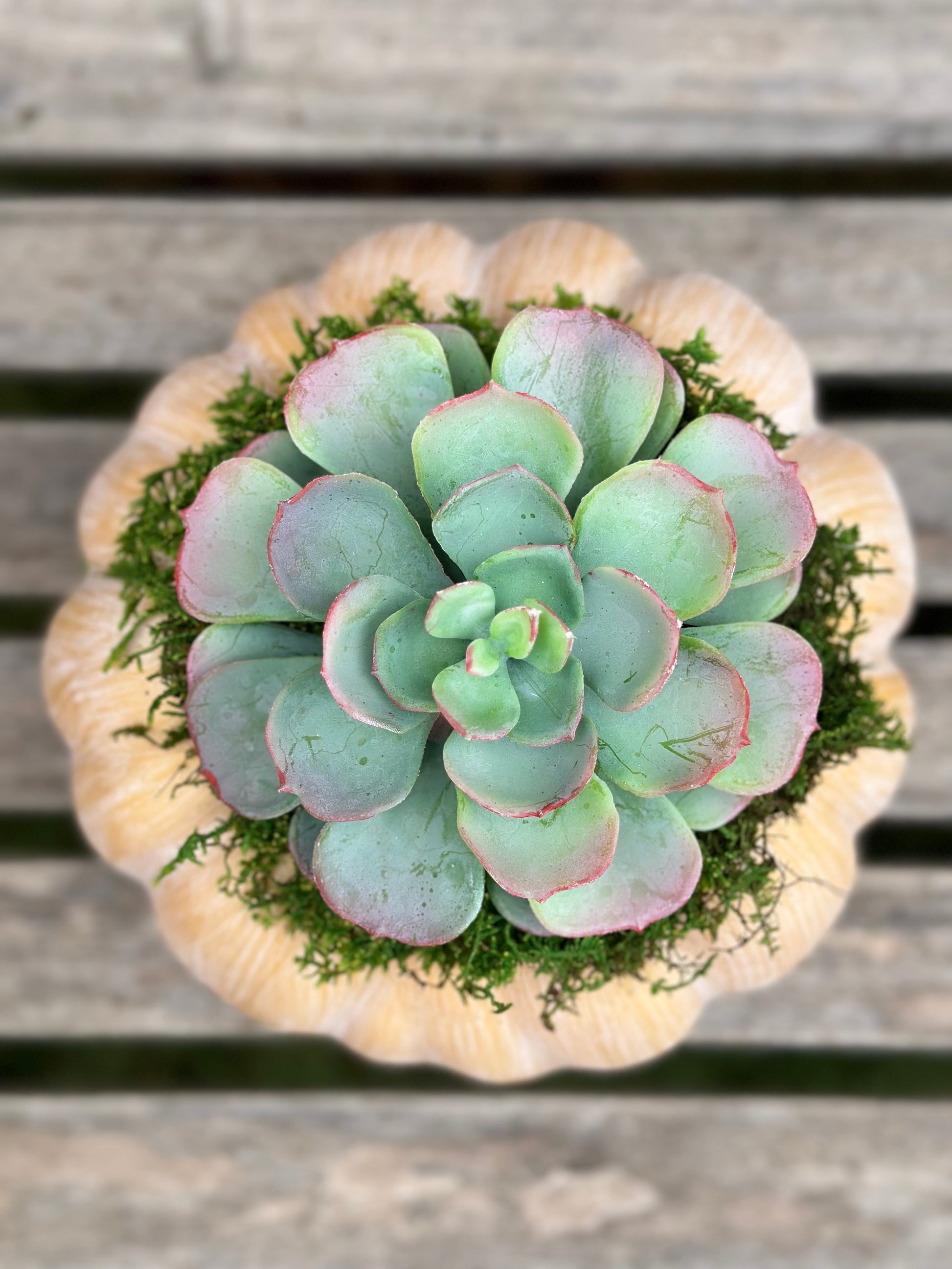 One small light orange faux fairytale pumpkin planted by hand with one large faux succulent.